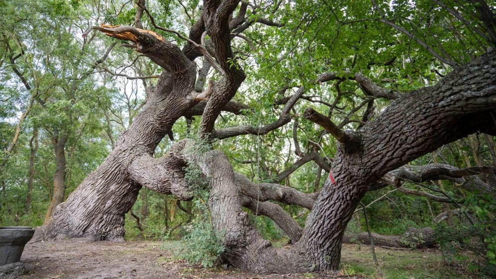 Un alt arbore faimos este Stejarul Îmbătrânit, considerat cel mai bătrân din pădure. Trunchiul său noduros și coroana imensă par desprinse dintr-o poveste fantastică.